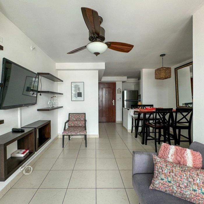 El apartamento modelo, con 58 m², está diseñado para maximizar cada metro cuadrado. Cuenta con una habitación espaciosa, dos baños completos y un área de sala-comedor integrada con la cocina. Es la elección perfecta para quienes buscan un hogar moderno y práctico, con acabados de calidad y un diseño que prioriza el confort.