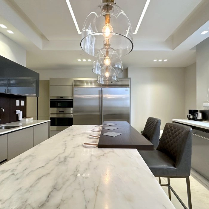La cocina, un refugio de inspiración culinaria, cuenta con aire acondicionado central y una lavandería adyacente para mayor conveniencia. A lo largo de la residencia, el piso de mármol irradia sofisticación, mientras que las puertas corredizas y las cerraduras de acero inoxidable encarnan tanto el estilo como la seguridad.